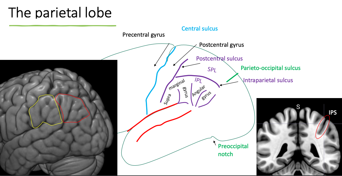 Intraparietal sulcus is important: sulcus is not just an empty space that seperates 2 regions, there is cortical areas within the sulcus. The IPS is a very large one, very deep and there’s a lot of cortex on each side of IPS.