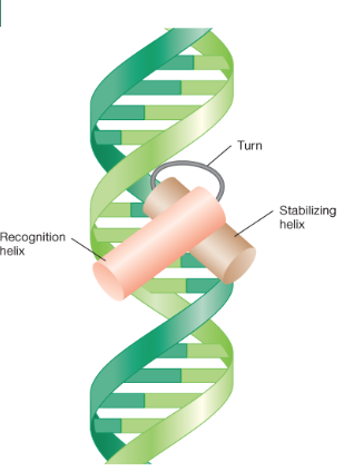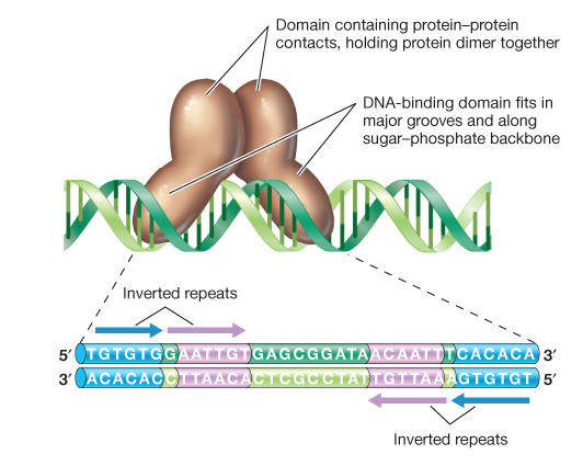 3) Activator and repressor proteins work in pairs (dimers) binding at two sites on the DNA. Two copies of the same protein work together. Each monomer has two domains. One domain is the recognition helix, which binds to DNA, and the other is the stabilizing helix, which holds the two dimers together. The dimers bind at inverted repeats in the DNA sequence.