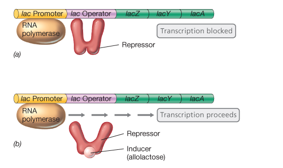 4) By helping RNA poly to find the promoter and bind to it (induction), or blocking the promoter so that RNA poly cannot find or bind to it or cannot move down the DNA (repression)