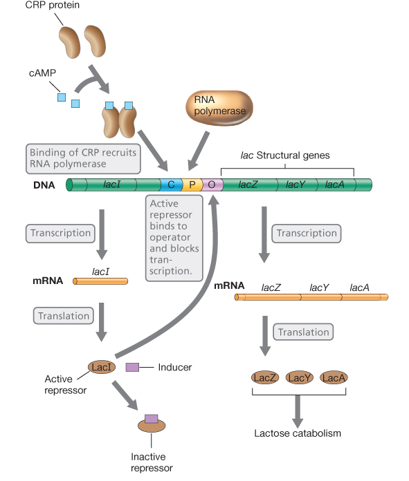 Key point: transcription of the lac operon is controlled by (1) repression-derepression of the lacI protein and allolactose (negative control) and by (2) the level of cAMP-CRP (positive control).