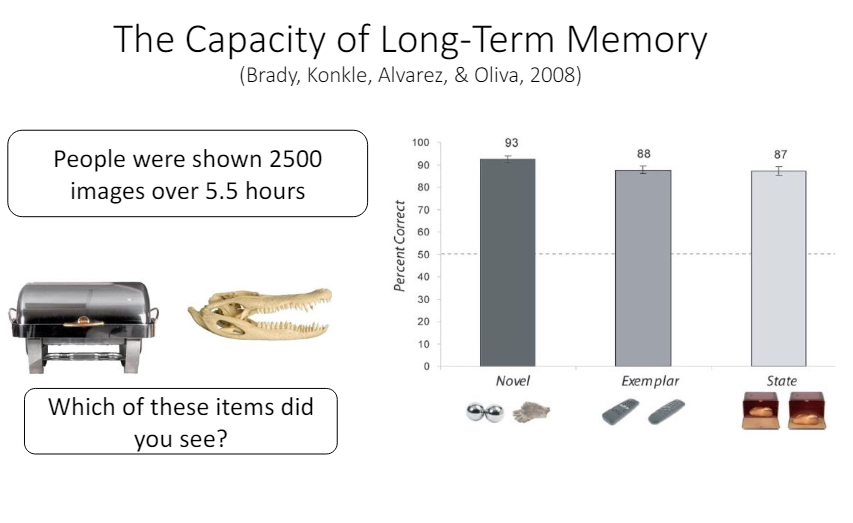 In a 2008 study, participants were shown 2500 images over 5.5 hours. Later, they were tested on pairs of images to identify which one they has seen before, demonstrating a high capacity for long-term memory