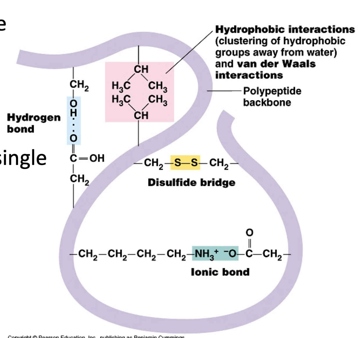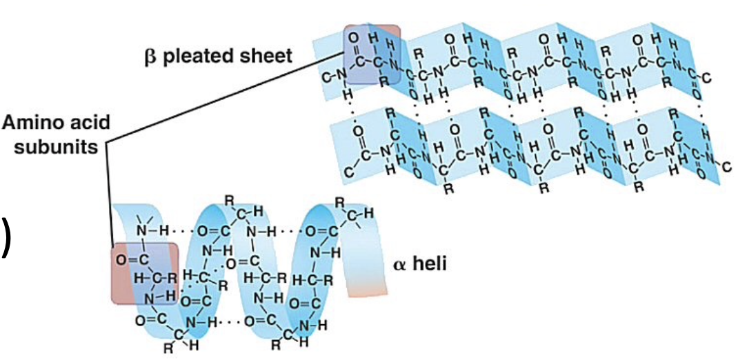 * Maintained by positive/negative charges, hydrogen bonds → α-helix or β-sheets