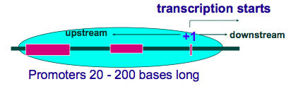 RNA polymerase binds to promoter regions and this determines where RNA synthesis begins -+1= start of transcription everything to the left= upstream, right= downstream promoters always upstream from the initiation point