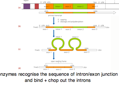 -there are sequences in the hnRNA that are cut out, the intervening sequences=introns= sequences that are transcribed but won’t go to be translated