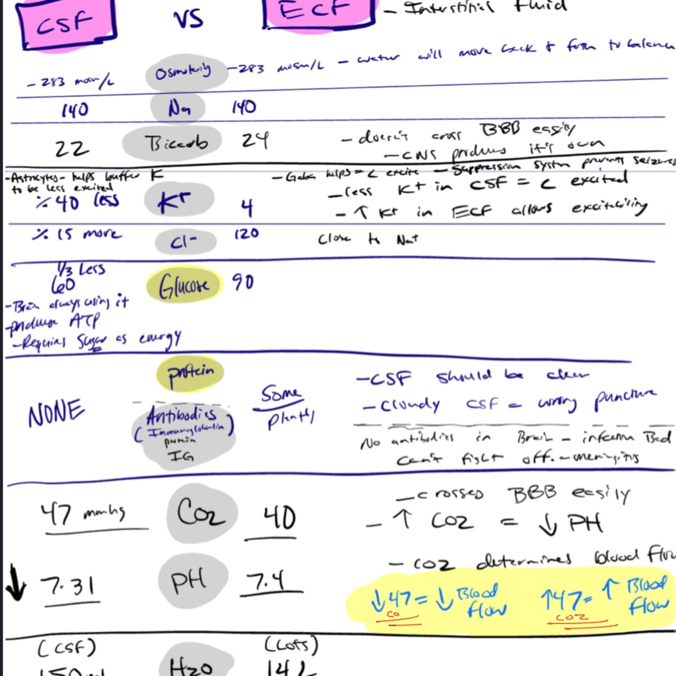 What are the properties of CSF compared to ECF elsewhere?