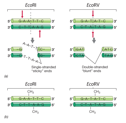 2) EcoR1 (E. coli) - leaves “sticky” end (overhang). Sma1 (Serratia marcescens) - leaves a blunt end.