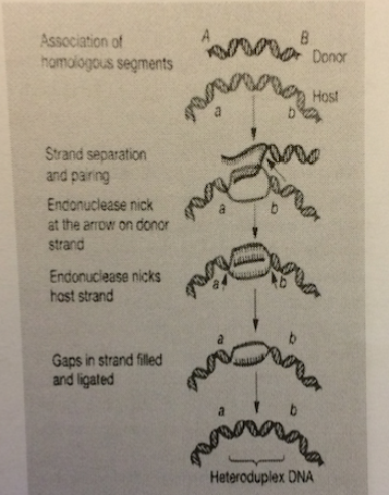 1) Digestion of incoming DNA by restriction endonuclease of recipient cell. Enzyme recognizes a specific DNA sequence (recognition sequence, an inverted repeat/palindrome) and cuts there or nearby.