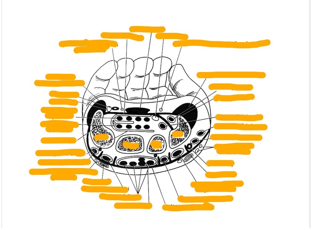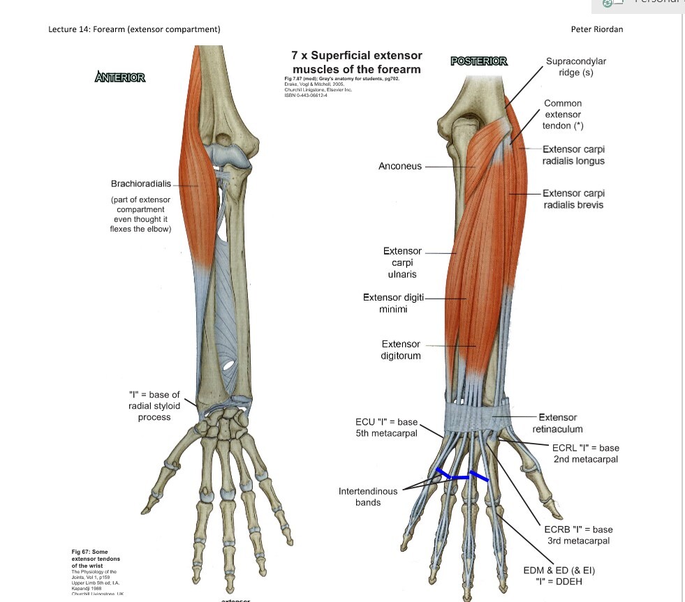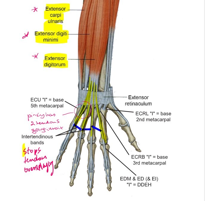 the long tendons of the the ED form the extensor expansion or hood over metacarpophalangeal joints and proximal phalanges and insert by three bands, a central one into the base of the middle phalanx and 2 lateral ones into the base of the distal phalanx.