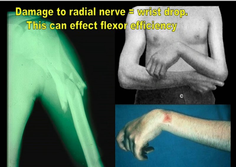 damage to radial nerve( e.g. upper humeral fracture) -> loss of innervation to the extensor muscles of the forearm-> cannot extend the wrist-> loses grip power-> cannot get any good strength from the forearm flexors( not in the optimal position)
