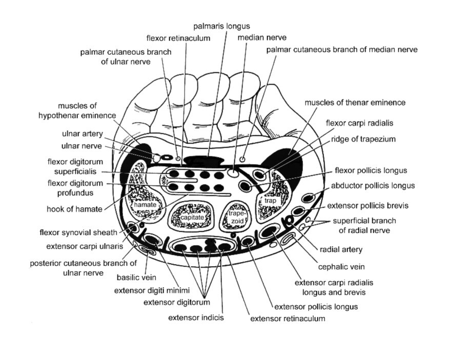 Posteriorly: the posterior cutaneous nerve of the forearm ( a branch of radial n)