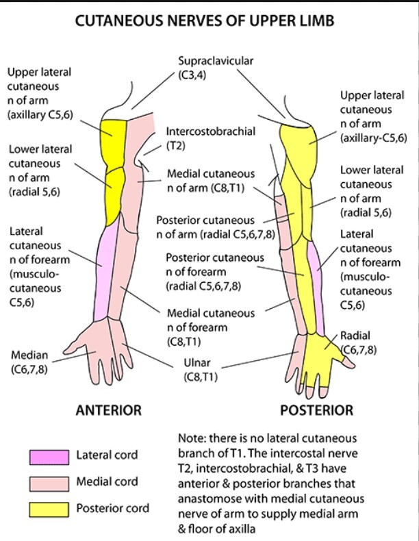 Laterally(forearm): the lateral cutaneous nerve of the forearm(terminal portion of musculocutaneous nerve from the lateral cord)