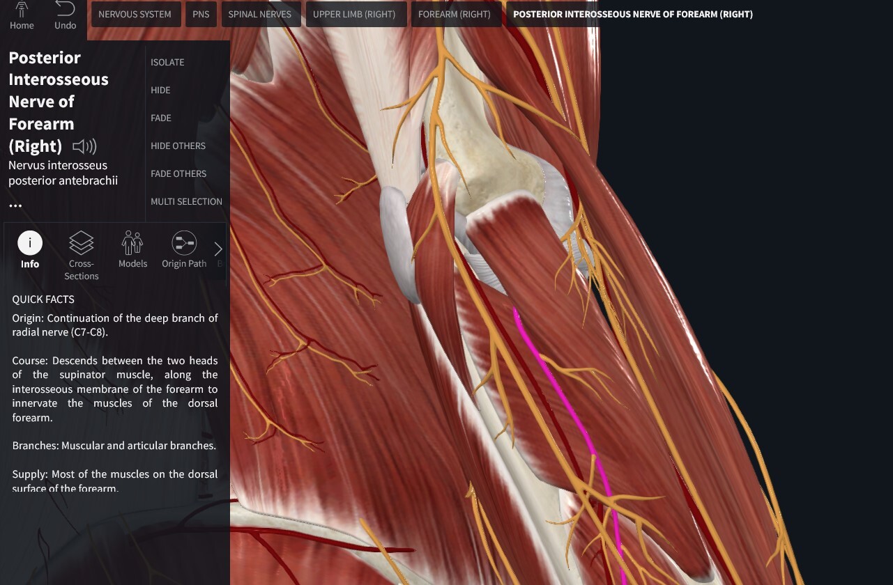 what is the name of the branch of the radial nerve that passes in between the heads of the supinator m?