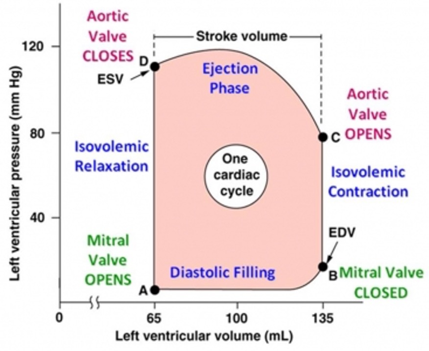 A 60 year old male has a resting heart rate of 75 beats/min, arterial pressure 130/85 mm Hg, body temperature was normal. Using the pressure volume diagram below.