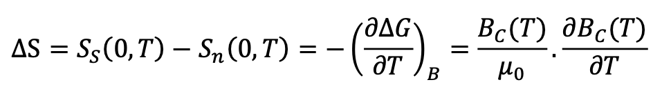Give the equation for the difference in entropy between the superconducting and the normal to the state