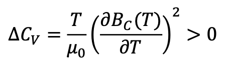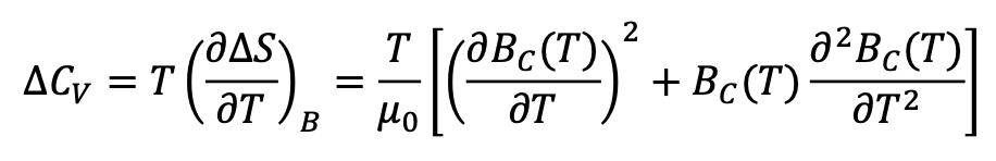 Give the equation for the difference in the specific heat at constant volume between the superconducting and the normal