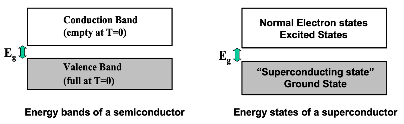 Compare the energy bands of a semiconductor to the energy states of a superconductor