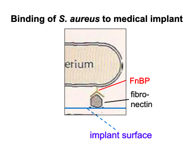 Fibronectin in blood coats the surface of medical implants. FnBP (fibronectin binding protein) on the surface of S.aureus mediates binding of bacteria to fibronectin. Attachment resembles bridging mechanism of adherance to host cells.