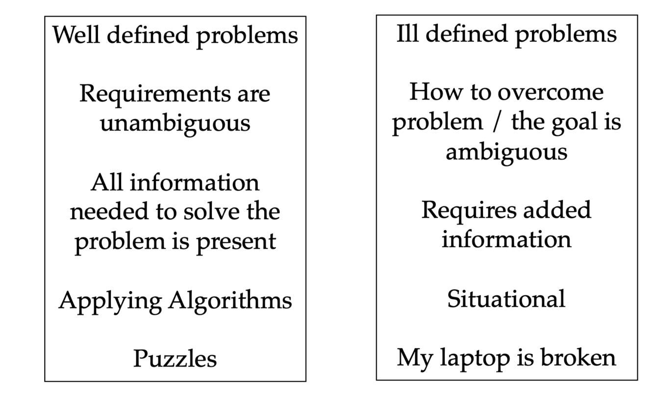 Well defined problems: Unambigious, straight path from problem to solution. Can apply existing rules or algorithms to reach a solution.