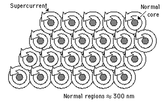 Supercurrents flow around cores, giving B = 0 in superconducting regions.