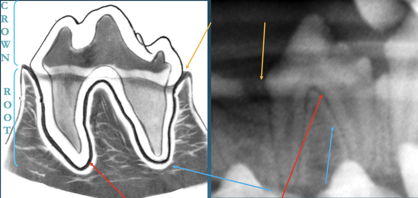 Red Arrows: periodontal membrane