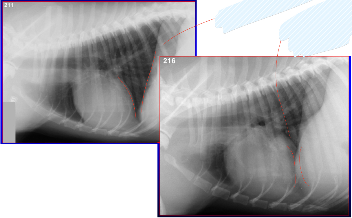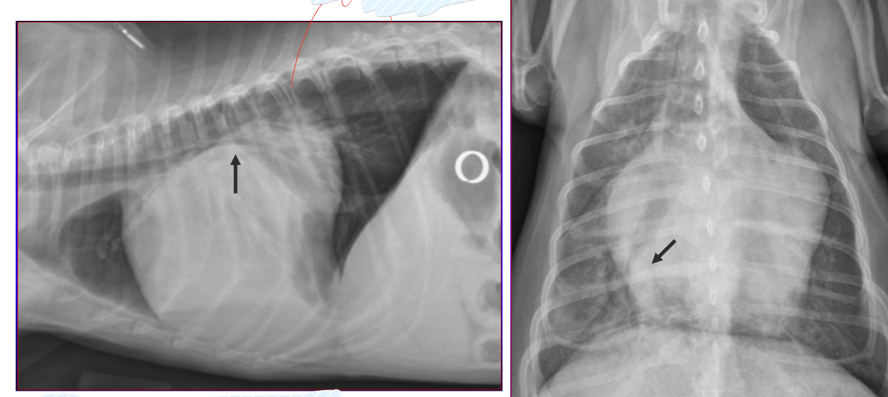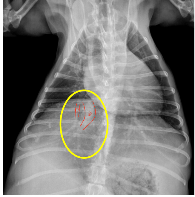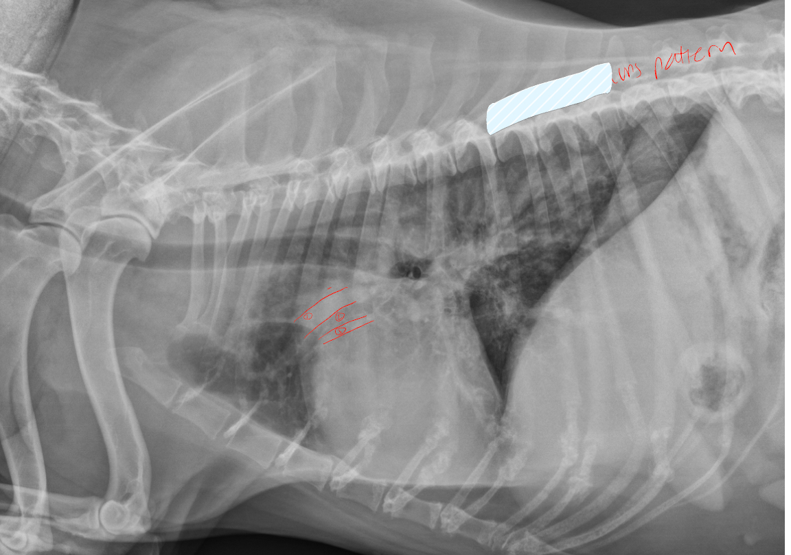 taken from 5yr old dog, identify 1+ 3, lung pattern and what is likely dx