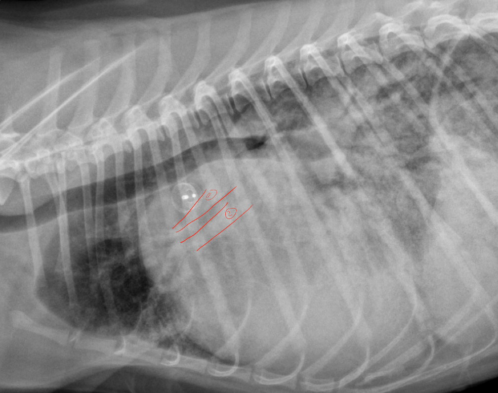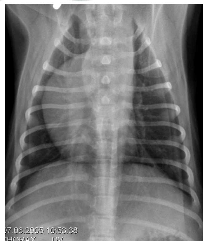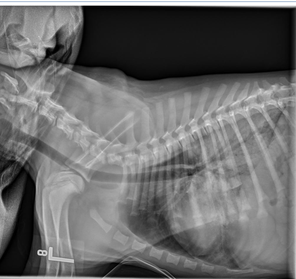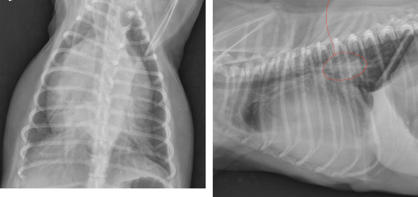 puppy presented in respiratory distress and burn marks on tongue, based on this x-ray what is dx and cause