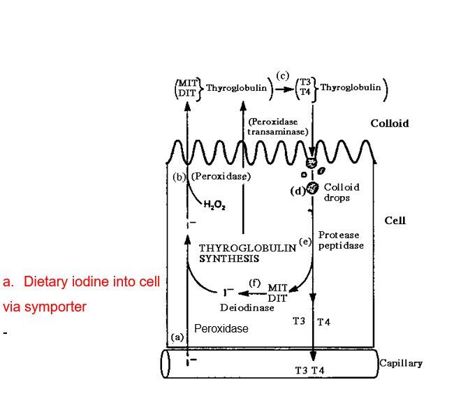a) Dietary iodine goes into cell (follicle?) via symporter