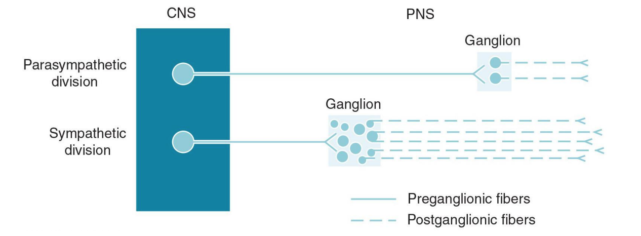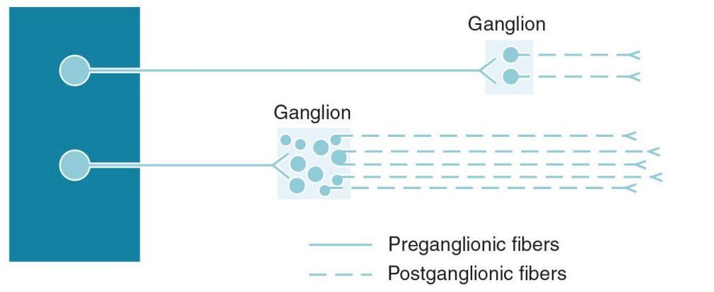SNS- Length of preganglionic axons and postganglionic axons