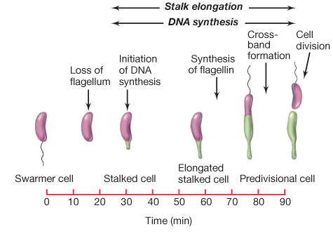 They have unequal binary fission, division of labor (stalked cell and swarmer cell). Differentiates a polarly flagellated swarmer cell.