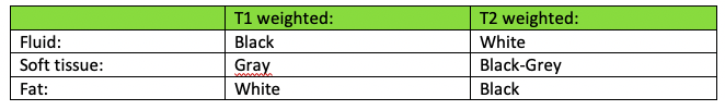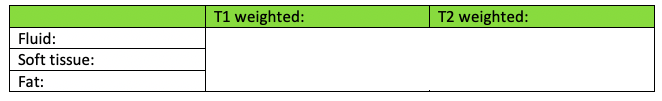 Fill in the differences in the table below for T1 and T2 weighted CT scans: