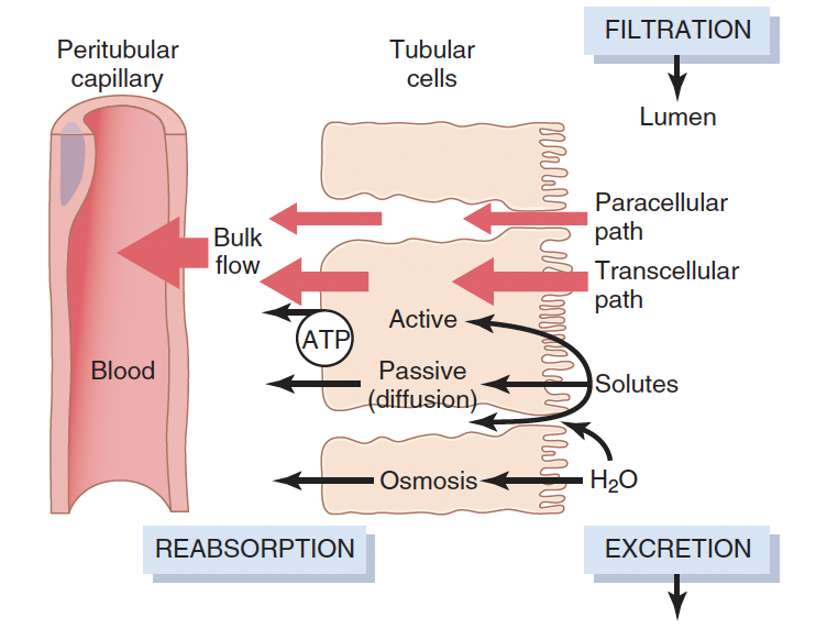 (1) Across the tubular epithelial membranes into the renal interstitial fluid