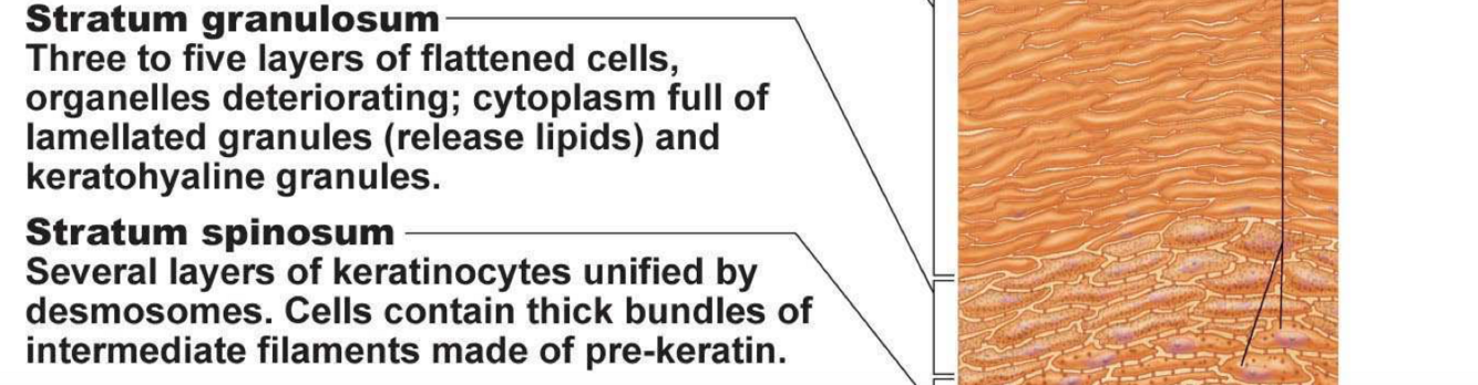 Stratum granulosum, releasing LAMELLATED GRANULES (fats)