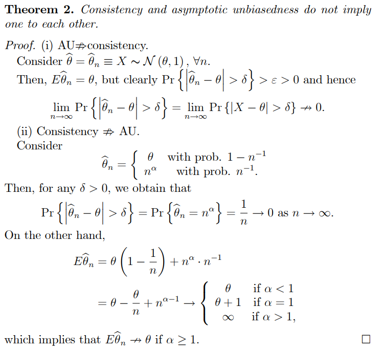 An estimator is asymptotically unbiased if lim as n->inf. E[θn] = θ
