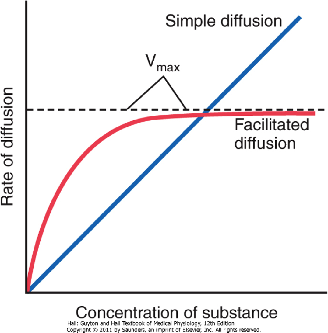 Facilitated Diffusion = logarithmic increase (dependent on the rate at which carrier protein can change conformation due to stimulus; Vmax cannot be greater than the rate of this change in conformation)