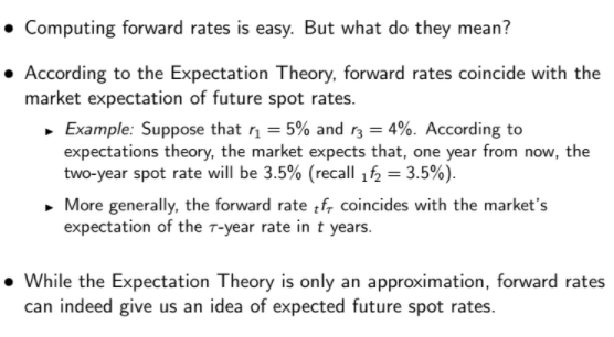 The Expectations Theory – also known as the Unbiased Expectations Theory – states that long-term interest rates hold a forecast for short-term interest rates in the future. The theory postulates that an investor earns the same amount of interest by investing in a one-year bond in the present and rolling the investment into a different one-year bond after one year as compared to purchasing a two-year bond in the present.