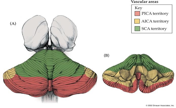 What are the 3 main arteries supplying the cerebellum and where abouts in the cerebellum do they supply?