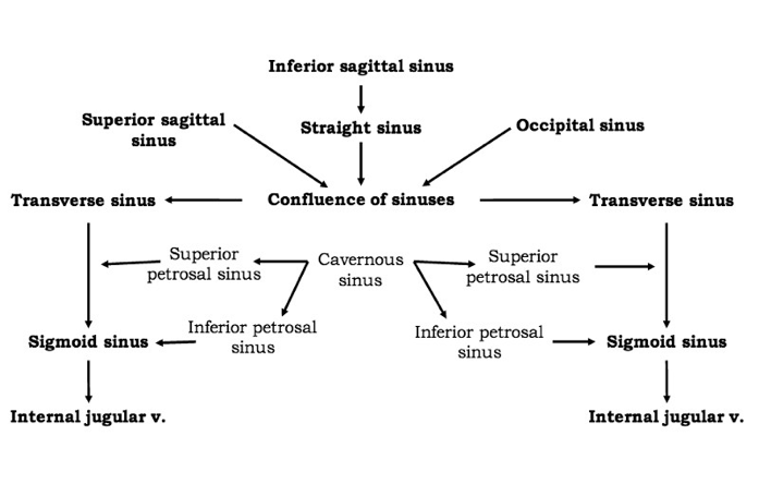venous channels found between the endosteal and meningeal layers of dura mater in the brain. They receive blood from internal and external veins of the brain, receive CSF from the subarachnoid space via arachnoid granulations and mainly empty into the internal jugular vein.