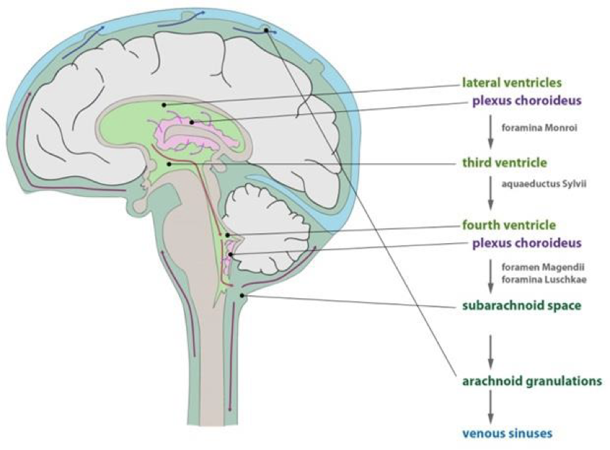CSF is produced by the choroid plexus à floor of lateral ventricles à through foramen of Monroe à roof of 3rd ventricle à aqueduct of sylvuis à posterior roof of 4th ventricle à foramen of Magendie à foramen of Luschka