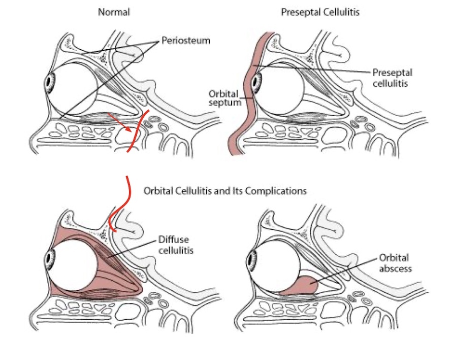 How do you differentiate preseptal cellulitis from orbital cellulitis?