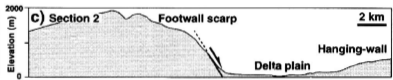 Large alluvial - on hanging wall dip slope Small foot-wall on fault scarps.