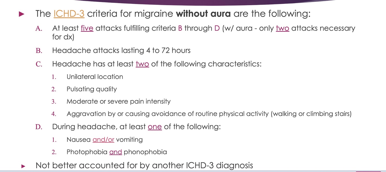 What is the diagnostic criteria for a migraine without aura?
