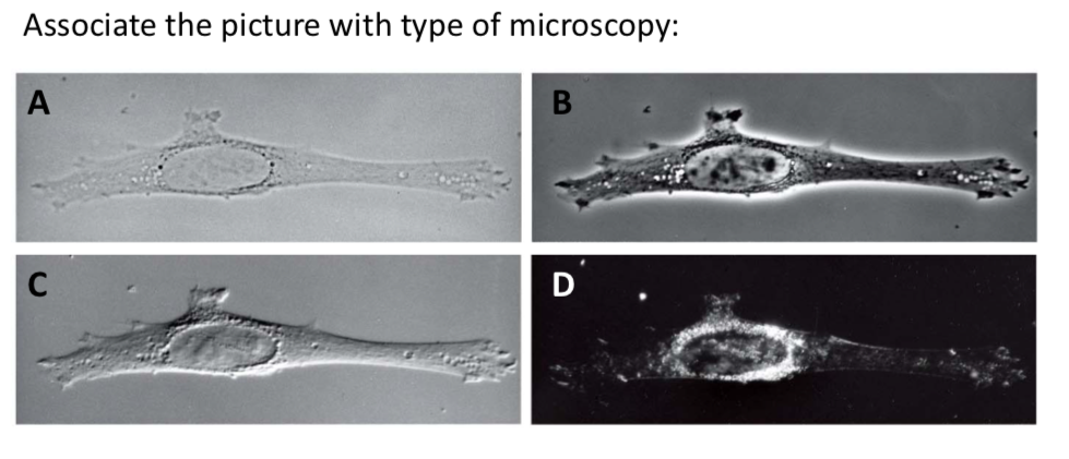 Phase Contrast and Differential Interference Contrast (DIC) microscopy: very dense regions appear darker than the background. DIC highlights the 3d nature of the specimen