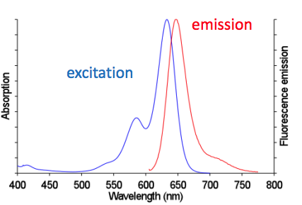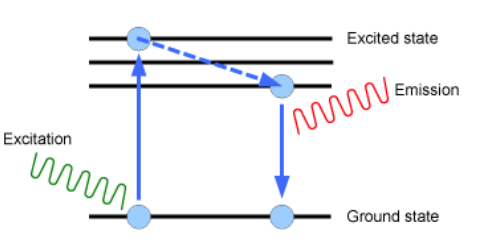 Fluorescent molecules absorb photons of light at one wavelength and emit at a lower energy one – If illuminated at the correct wavelength and viewed through a filter corresponding to the emission, will “glow” against a dark background