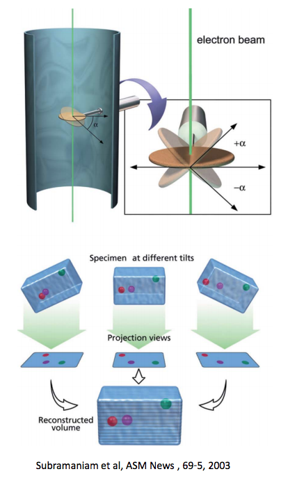 The specimen is tilted to varying angles along an axis perpendicular to the electron beam