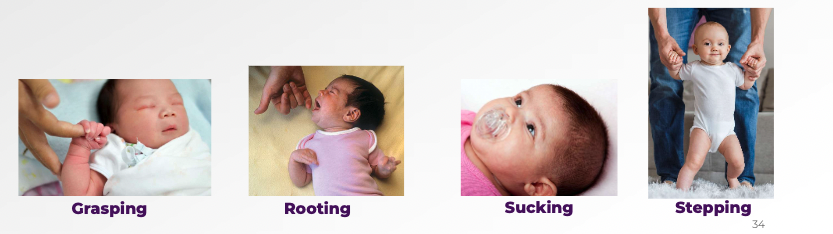 *E.g. tonic neck reflex: when an infant’s head is turned to the side, their arm on that side extends and the arm and knee on the other side flex (looks like they are fencing).