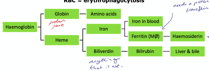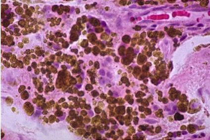 Coarse, granular, golden-brown pigment. Haemoglobin in RBC breaks down into haemosiderin (an accumulation in tissues)