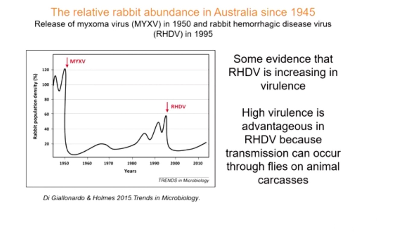 (Evolved to intermediate virulence, not lethal enough to kill before transmission occurs and rabbits evolved some resistance )