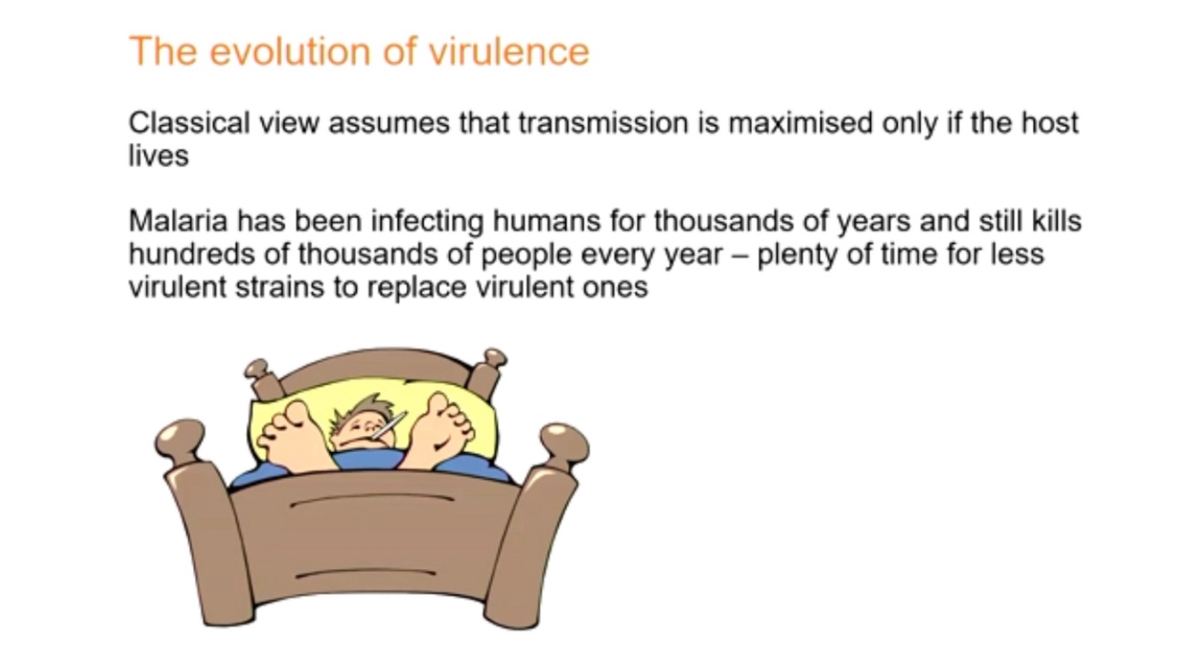 This is because damage to the host must ultimately be detrimental to the intrests of the pathogens that live within it (what this means is if its more virulent, it’ll cause you to stay at home and sick in bed you’ll have less chance of transmission. Where as less virulent causes you to have more chance of transmission