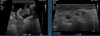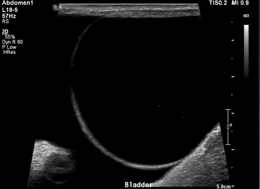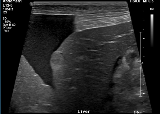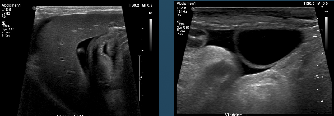 anechoic effusion around liver (left) and bladder (right)