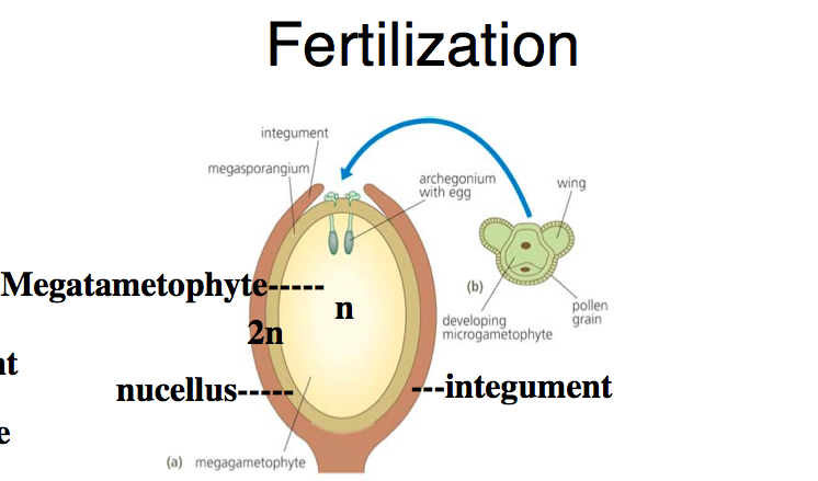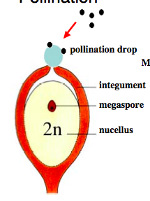 • Pollen grains are transported to the ovule (female gamete) prior to sperm cell development. • Pollen are wind-blown to the female ovule. • The sperm cells do not require free water. -sticky ovules= draw in the pollen